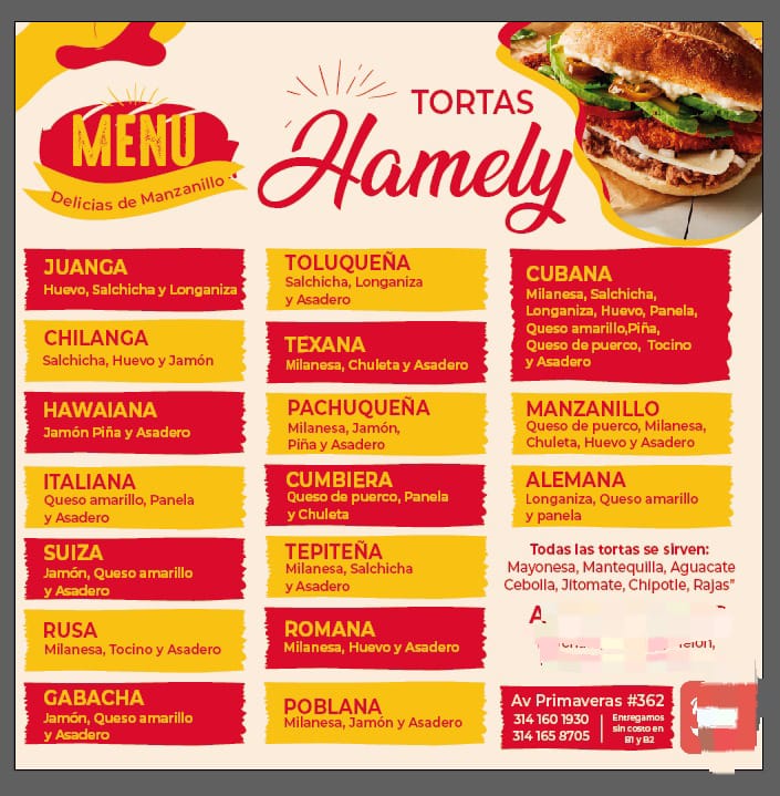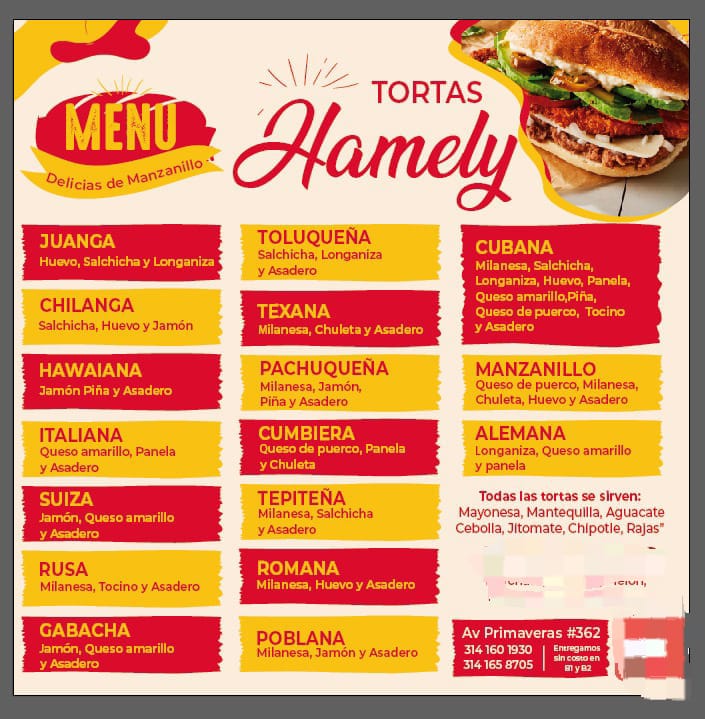TORTAS HAMELY, located at Av. Primaveras 362 in Manzanillo, Colima, is a distinguished restaurant known for serving authentic local delicacies that capture the true flavors of the region. Specializing in traditional Mexican tortas, this establishment has become a popular destination for those seeking homemade taste and high-quality ingredients in every bite. Its welcoming atmosphere and attentive service provide a pleasant dining experience for families and visitors alike. Although currently holding an initial Google rating, TORTAS HAMELY is dedicated to freshness and authentic flavor, aiming to earn the preference of its customers. For more information or to place orders, interested individuals can contact them at 314 160 1930 or visit their profile at https://directoriocolima.com. TORTAS HAMELY is a must-visit spot for anyone looking to enjoy traditional cuisine in Manzanillo, combining fresh ingredients with carefully crafted recipes that reflect the local culture.